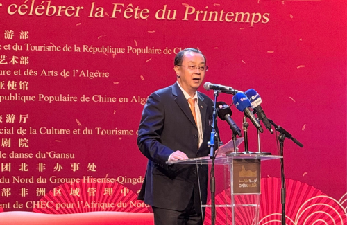 大家好!在中国传统佳节春节即将来临之际,我们欢聚于此,共同拉开2026“阿尔及尔·欢乐春节”文艺演出的帷幕。首先,我谨代表中国驻阿尔及利亚使馆,向阿尔及利亚文化和艺术部、阿尔及尔歌剧院的鼎力支持致以诚挚谢意!向远道而来的甘肃省歌舞剧院全体艺术家表示热烈欢迎!向在座各位中阿友好人士、使团同事们送上马年最美好的祝福!